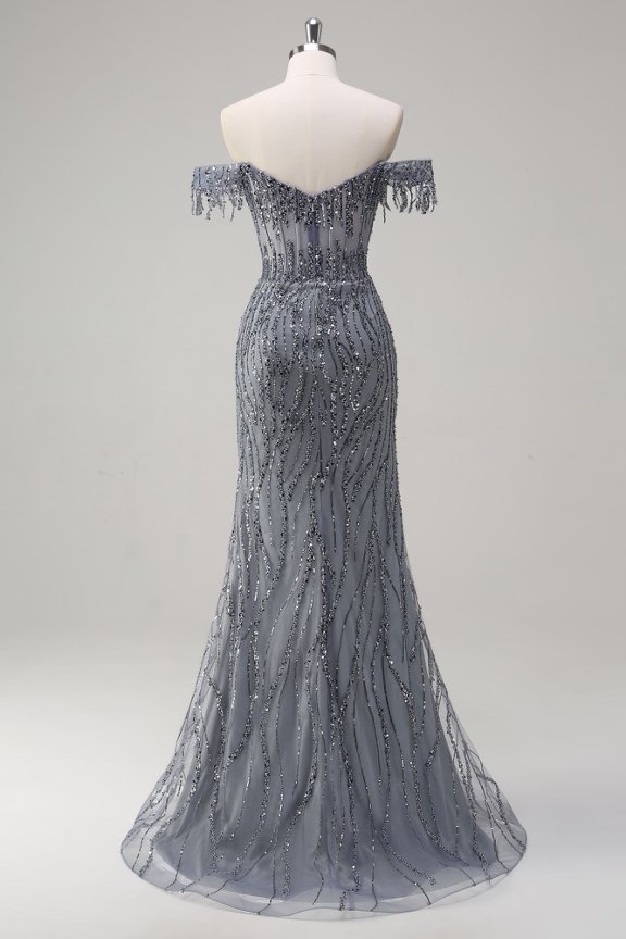 Champagne Beaded Mermaid Gown | Off-the-Shoulder Evening Dress with High Slit