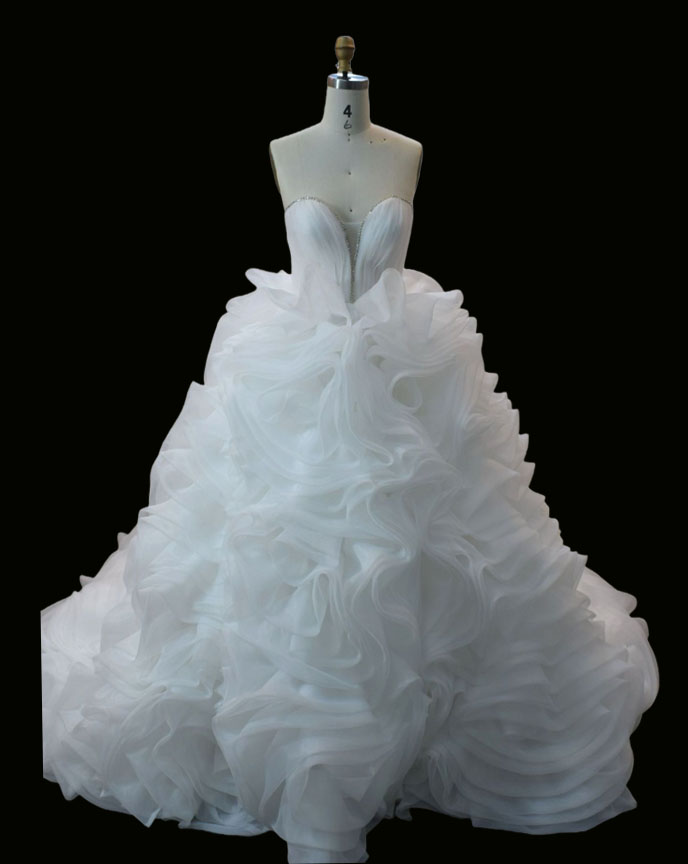 cathedral train wedding dress, grand ball gown, sweetheart neckline wedding dress, organza ball gown, princess wedding dress, dramatic wedding gown, full skirt wedding dress, church wedding gown, layers of organza dress, voluminous bridal gown