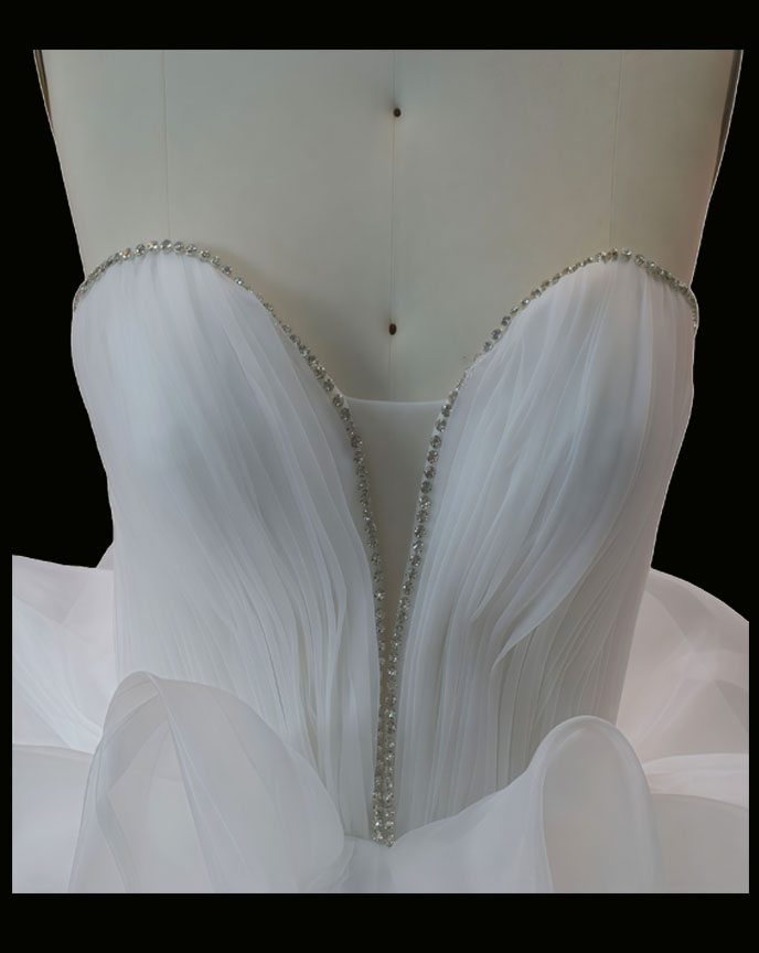 The gown focuses on architectural volume and texture. The structured bodice provides a secure and sculpted fit, often featuring internal boning for support. The skirt is the masterpiece: built from a foundation of supportive tulle and then layered with abundance of high-quality, lightweight organza. Each layer is carefully gathered and attached to create a multidimensional, cloud-like effect that is both incredibly grand and surprisingly light to wear.