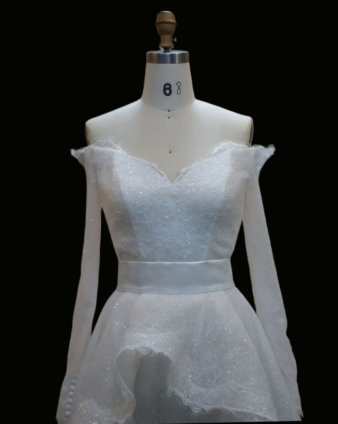 Embrace modern romance with a touch of artistic flair in our Off-the-Shoulder A-Line wedding dress. This gown is designed for the fashion-forward bride who appreciates timeless elegance with a contemporary edge. The classic off-the-shoulder neckline and full-length lace sleeves offer a look of sophisticated grace, while the defined high waist creates a beautifully elongated silhouette. The design culminates in a soft A-line skirt with an intentionally asymmetrical hem, adding unexpected movement, dimension, and a uniquely memorable detail to your walk down the aisle.