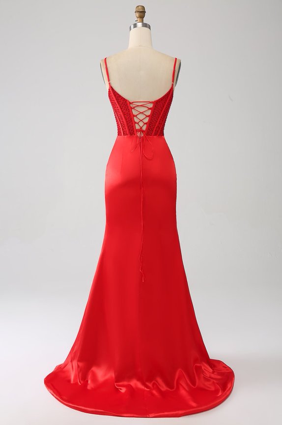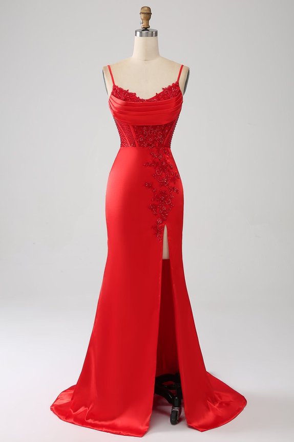 Red Satin Mermaid Gown with High Slit & Spaghetti Straps | Formal Evening Dress
