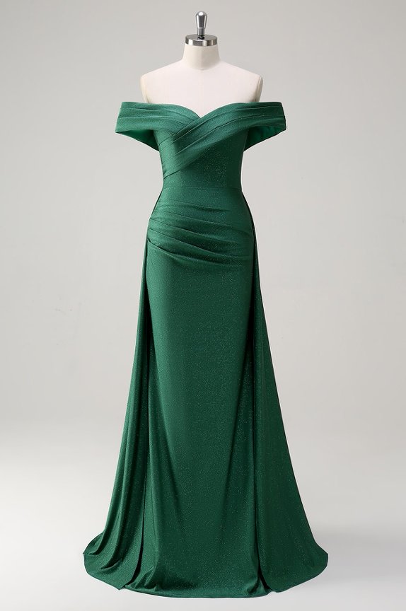 Discover our elegant forest green off-the-shoulder evening gown. This timeless, floor-length dress is perfect for formal weddings, galas, and black-tie events. Shop sophisticated elegance.