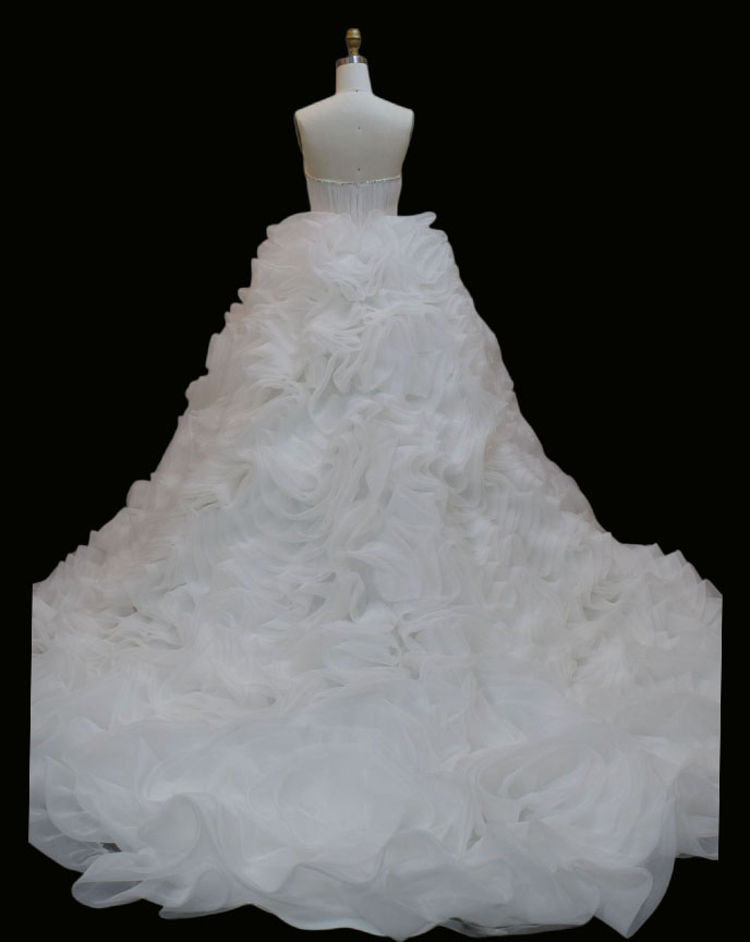 The gown focuses on architectural volume and texture. The structured bodice provides a secure and sculpted fit, often featuring internal boning for support. The skirt is the masterpiece: built from a foundation of supportive tulle and then layered with abundance of high-quality, lightweight organza. Each layer is carefully gathered and attached to create a multidimensional, cloud-like effect that is both incredibly grand and surprisingly light to wear.