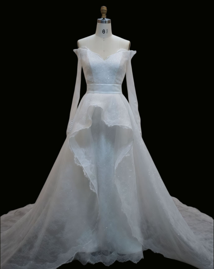 Embrace modern romance with a touch of artistic flair in our Off-the-Shoulder A-Line wedding dress. This gown is designed for the fashion-forward bride who appreciates timeless elegance with a contemporary edge. The classic off-the-shoulder neckline and full-length lace sleeves offer a look of sophisticated grace, while the defined high waist creates a beautifully elongated silhouette. The design culminates in a soft A-line skirt with an intentionally asymmetrical hem, adding unexpected movement, dimension, and a uniquely memorable detail to your walk down the aisle.